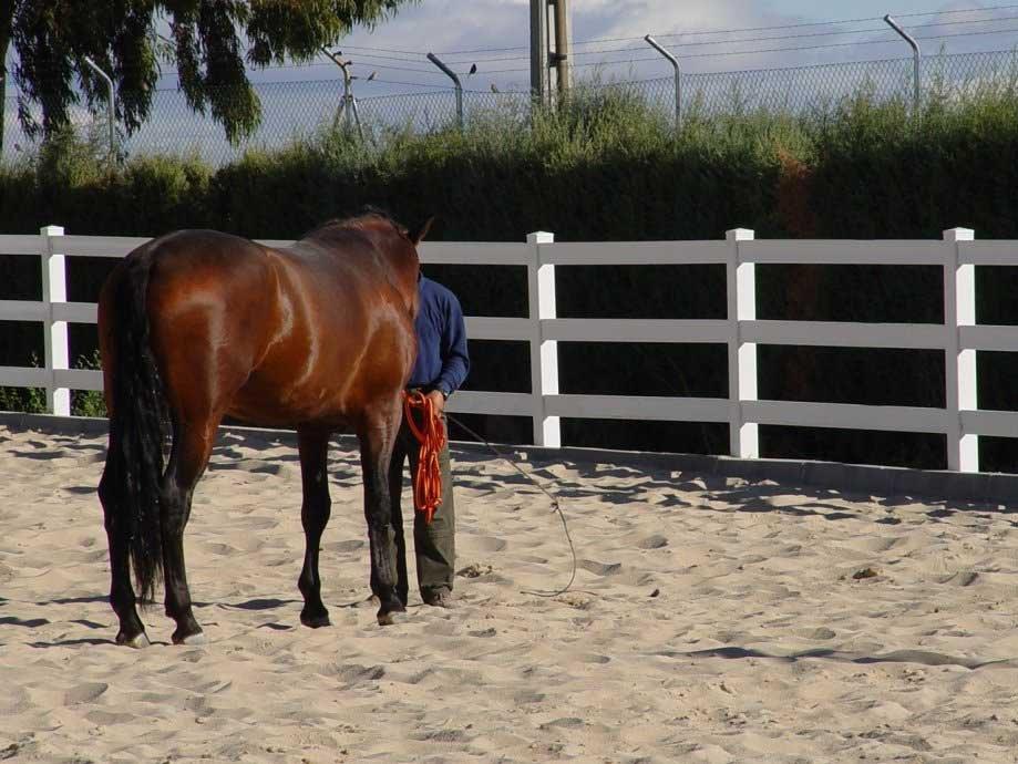 Detalle Post-rail h 1,5 m 3 travesaños, separación especial entre postes 2 m. Caminador Yeguada Cuabas (Madrid)